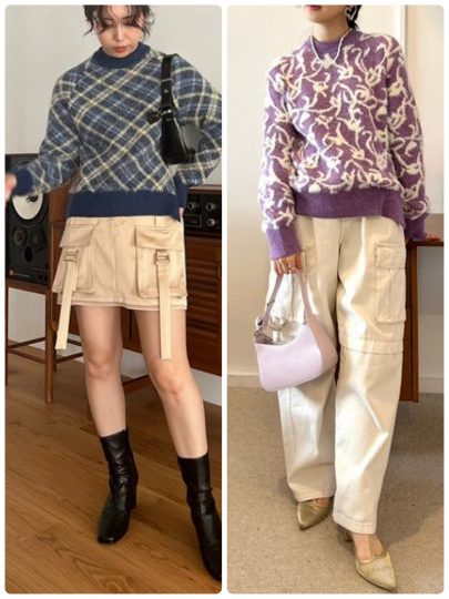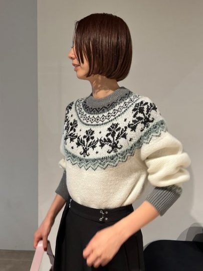 モヘアやフェザーなどの糸を使った、キャッチーなジャガードニット。ノルディック、フラワー、チェックと、カラーのよって柄が違います。身体を包み込むオーバーサイズシルエットはどんなボトムスともバランスが取りやすく、ファスナーのサイドスリットでデザイン性をプラス。ほっこり見えしないトレンド感がポイントです。