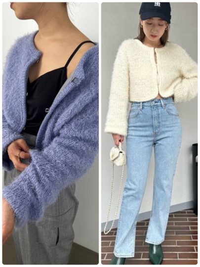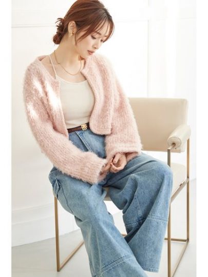 モヘア混の糸を編み上げて、ファーのような素材感でリッチに魅せるニットジャケット。毛足感のある柔らかなニット素材に、裏地をあしらい上品なスタイルに。編地を変えたパイピングやフロントのメタルのホックもポイント。さり気ないラメ入りで華やかさも演出しています。
