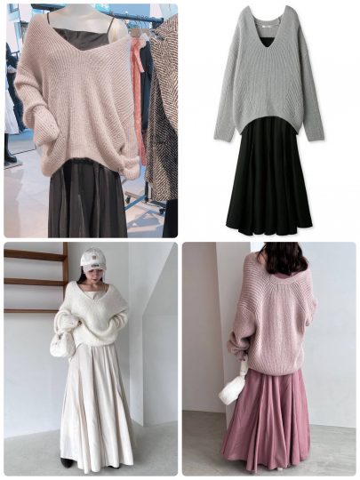 リラクシーなビッグニットは深めのVネックで、肩を落としてワンショル風に着こなすのがオススメ。セットのサテンキャミワンピはスリムなシルエットで華奢なストラップがポイント。それぞれ単品でも着用可能なのでコーデの幅が広がりそう。
