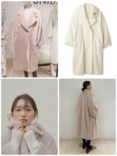 ふわふわの毛質が最強に可愛いシャギーコート。ヒザが隠れるくらいのレングスで、後ろから見た時のボリューム感も秀逸。スリーブもルーズで愛され女子のマストアウターになりそう♡