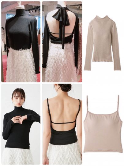 大胆なバックスタイルと大きなリボンが特徴。ニットはほんのり透け感があるシアーなタイプ。インナー付きなので安心、ストラップもそのままデザインとして楽しめます。