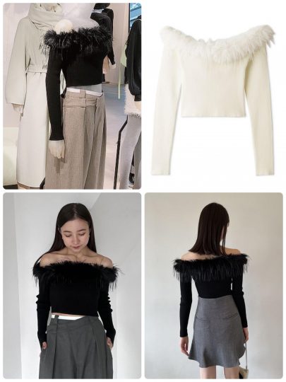タイトなオフショルニットにフェイクファーをドッキング! 冬の肌見せは3割り増しの可愛さ確定です♡