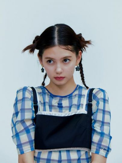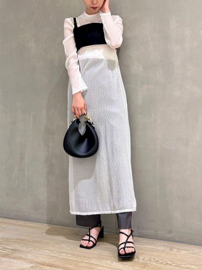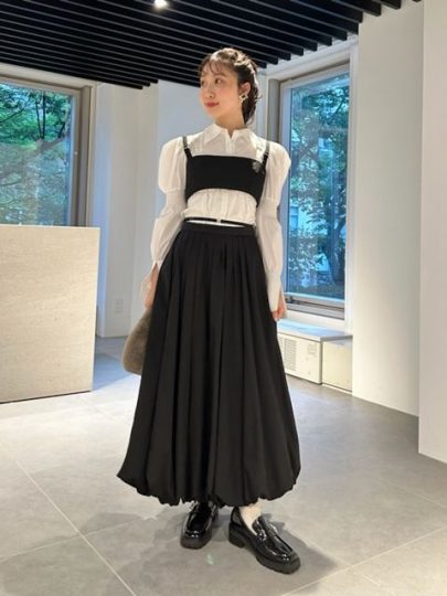 パッと見、フェミニンモードですがフロントにはビジューとスタッズを散らしてリュクスな雰囲気も漂わせました。