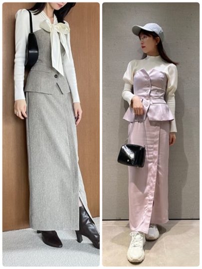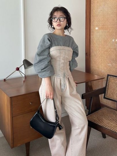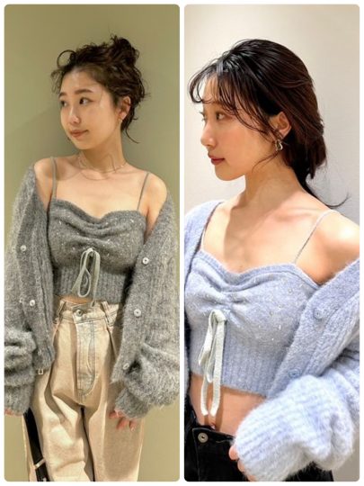 ソフトなタッチのふわふわニットビスチェは短丈仕立てで、ハイウエストボトムとの相性バツグン。ニットカーデを羽織ったり、あえて辛口モードなシャツとのレイヤードがおすすめです。