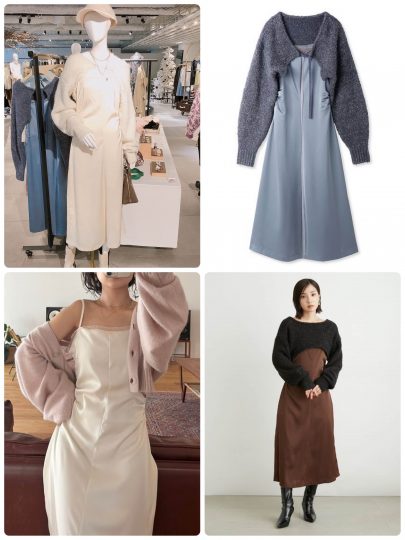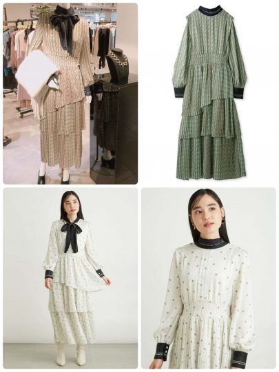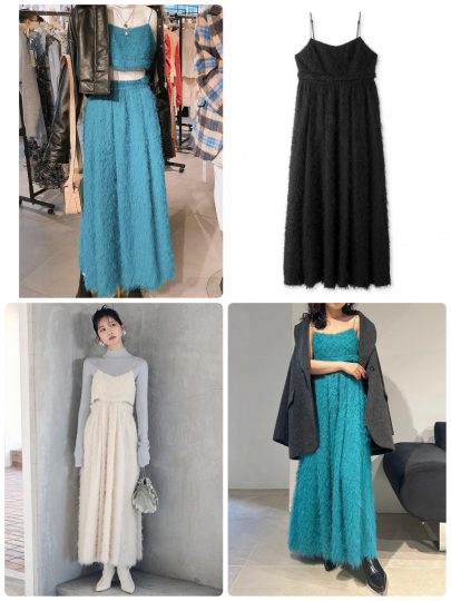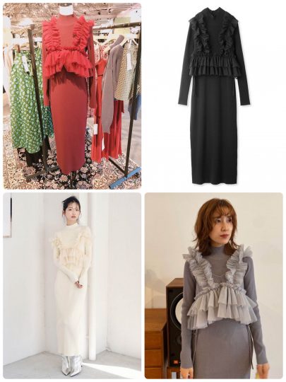 昨年人気だったビスチェ付きニットワンピースが、今季はチュール素材で登場! チュールがボリュームたっぷりな分、ニットワンピはIラインのタイトシルエットでバランス◎