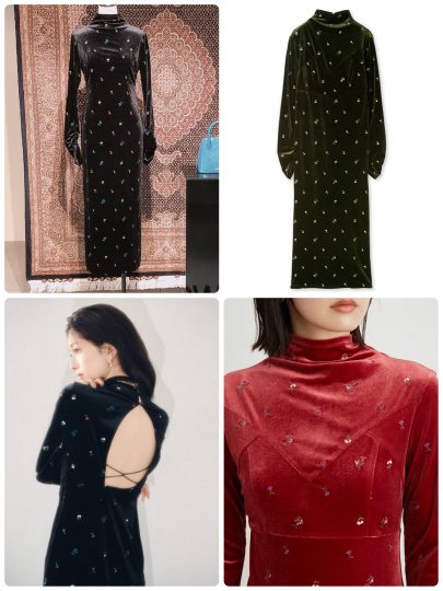 伸縮性のあるベロア素材なのでIラインシルエットでも着心地がよく、足さばきも楽ちん。オリジナルの小花刺繍が華やかな印象です。