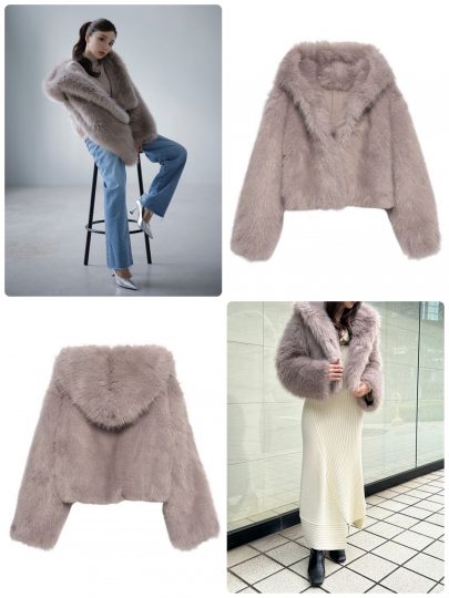 身頃部分を毛足の短いファー、襟部分を毛足の長いファーで仕上げたコンビジャケット。顔まわりが華やかになるアウターです。
