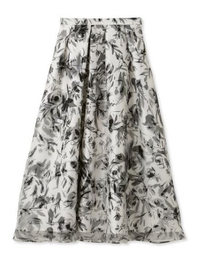 オリジナルの大胆な水彩タッチの花柄をプリントしたスカート。オーガンジーと光沢感のあるグログラン素材の両方にプリントし、重ねることで奥行きを持たせたデザインに。ランダムタックが表情豊かに広がります。