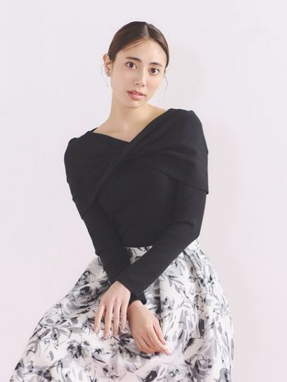 適度な肉感で柔らかなリブ編ニット。襟まわりにはツイストさせたケープ衿を付け、鎖骨が綺麗に見えるボートネック。どんなボトムとも合わせられる万能なニットプルオーバーです。
