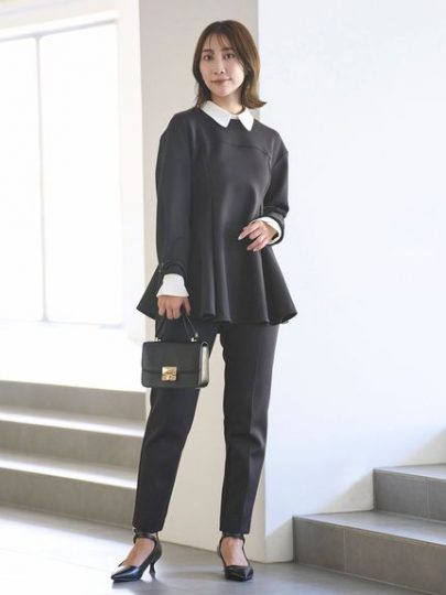 上品な光沢感とハリのある風合いが特徴で、着崩れせずシルエットをキープ。ストレッチ性があり、柔らかで肌当たりも良くストレスフリーな着心地。トップスの白襟とカフスは取り外し可能。パンツは細身のテーパードのフィット&フレアシルエットで、スタイルアップ効果も期待できるはず。