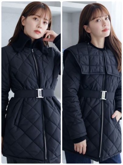大きめのキルティングステッチがトレンド感のあるミドル丈アウター。スクエアビックカラーとリブニットカラーの2種類の取り外し可能な衿がセットになっていて、印象の違う様々な着こなしを楽しめます。中綿入りで保温性が高く、軽いのも嬉しいポイント。