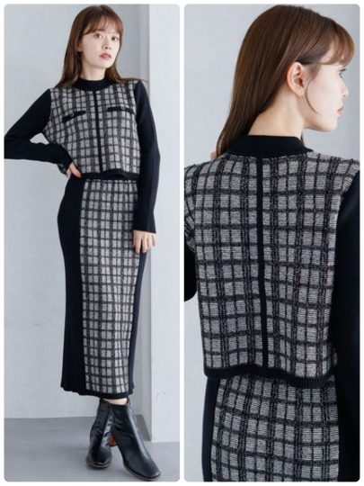 ラメ入りのブロッキングチェック柄とポケットディティールで上品さと立体感を表現した、ショート丈ニットとハイウエストニットタイトスカートのセットアイテム。ツイードジャケットからインスピレーションを受けた、今季らしいデザインが素敵。