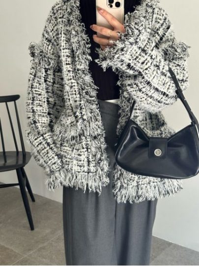 ツイードライクなMIX編みのニットジャケットは、1枚で着映えする存在感。フリンジが華やかなアクセントを加え、胸元はVネックですっきり見せ、ヒップにかかるミドル丈は、さまざまなボトムスと合わせやすく着回し力も抜群。