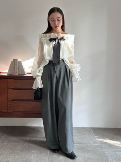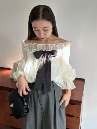 リボンを結べば」スタンドカラーとして、リボンを緩めるとオフショルとして2WAYで着られる仕様。上品な透け感のある素材が女性らしい印象に導き、襟まわりにはたっぷりギャザーを寄せてボリュームを出すことで、小顔効果もプラス。透け感のあるオーガンジー素材ながら、裏地付きだからインナーの心配いらず。