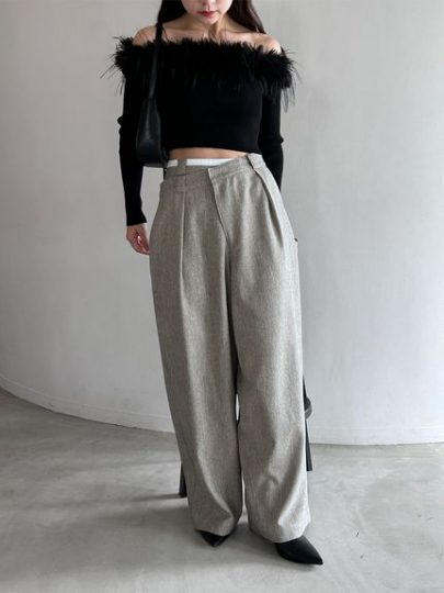 ウエストが二重になったようなアシンメトリーなデザインで、ひねりを効かせたワイドパンツ。さりげない白のラインと前下がりになったウエストも感度を高める仕掛けに。さらにタックが入ったややコクーンなフォルムがエッジを加え、モードな佇まいを叶えてくれます。