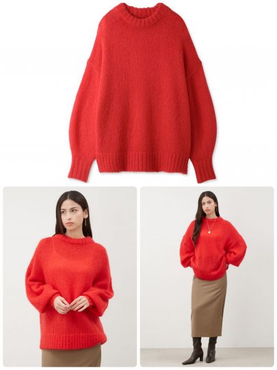 暖かさと軽さを兼ね備えた、ふんわり柔らかなモヘア素材。ざっくり編み上げたルーズ感で、ふくらみのある衿ぐり、ボリューミーなパフスリーブがポイントです。