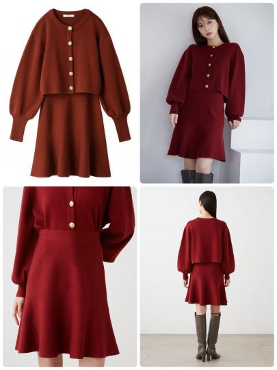 単品でも着用できる、ノーカラーのカーディガンとフレアミニをセットに。