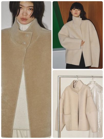 ボアを全面に配したデザインでもカジュアルすぎない理由は小粒のボア素材にあり。テーラーカラーのほか、襟を立ててバルカマンコートのように着こなすこともできます。