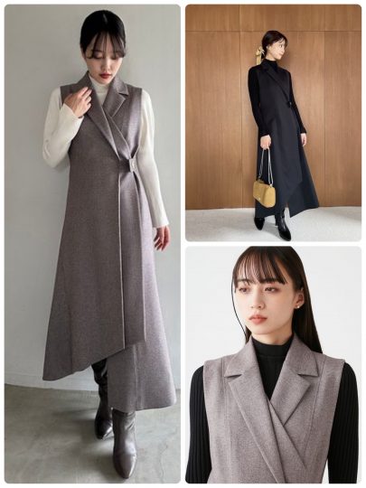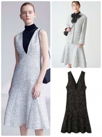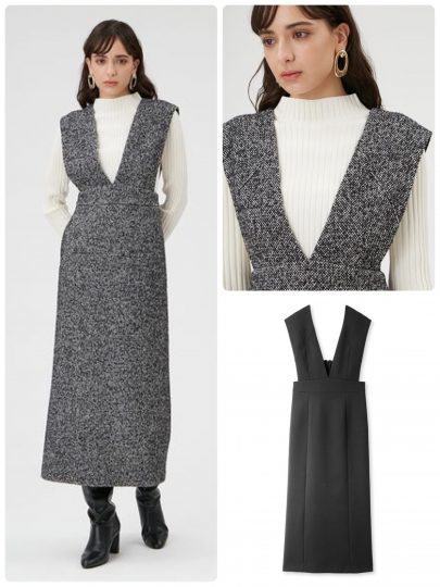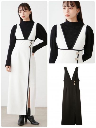 ホワイト、MIX、ブラックの3色展開でホワイトとMIXはツイード、ブラックはツイード素材で仕立てています。深いVネックと女性らしさを醸し出す優雅なマーメイドシルエットが最大のポイント。かっちりとしたジャケットを組み合わせて、七五三やセレモニーに起用するのも◎です。