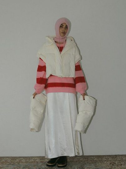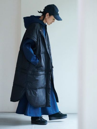 去年に引き続き、emmi×スタイリスト金子綾さんコラボのダウンが登場!去年、買えなかった人必見です。画像上のように全て装着してロングコーチに。画像下のように袖を外してロングジレに。画像にはありませんが、裾部分を外してショート丈のダウンとベストにすることも可能。