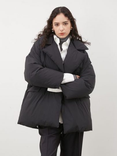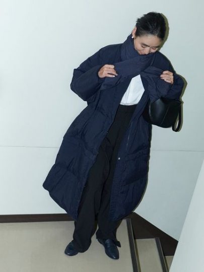 ダウンには珍しい衿で、Pコートのように着られるデザインダウン。お尻は隠れるけど、長過ぎない丈感も絶妙。ダウン初心者にもおすすめ。