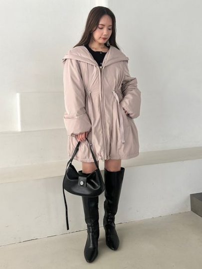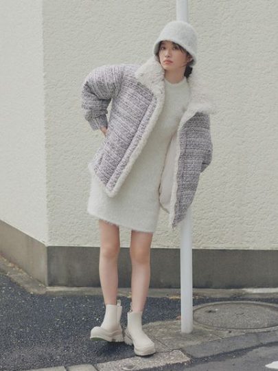 ラフなイメージが強いダウンジャケットを、ラメ糸やスパンコールをあしらったツイードベースでSNIDELらしく、上品かつフェミニンにアレンジ。外メインのデートなどに大活躍しそう♡