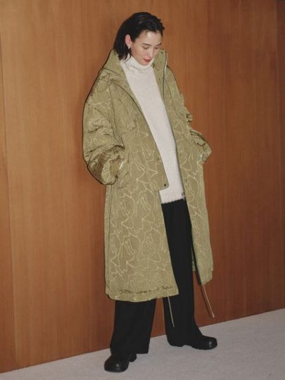 アウターで人と差をつけたい人に!国内でオリジナルで織り上げたジャガード生地を使用した高級感あふれるダウンコート。上品な艶感と、生地自体に膨らみがあるジャガードなのでこんなにたっぷり生地を使用しても軽いところが魅力的。