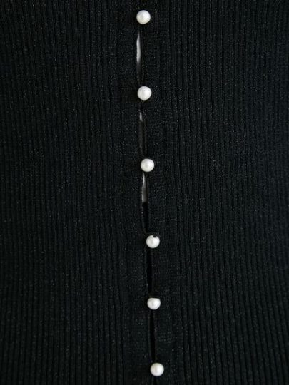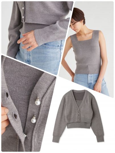 柔らかい風合いのニットアンサンブル。インナーはリブ編みで身体のラインに沿うようなフィット感のある着心地。カーディガンはトレンド感のあるクロップド丈で、広く開いた襟ぐりが抜け感を演出してくれます。ビジューとパールが組み合わさったボタンがラグジュアリーな印象に。