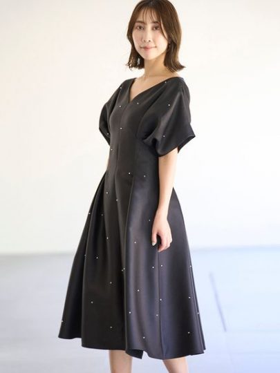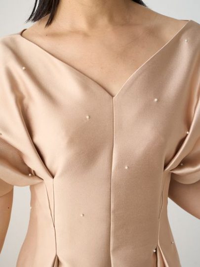 微光沢の張りのある生地に4ミリサイズのパールをトッピング。フィット&フレアのシルエットでドラマチックに着られます。大きめの袖とハートネックがウエストの細さをより強調するシルエットに。