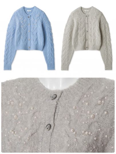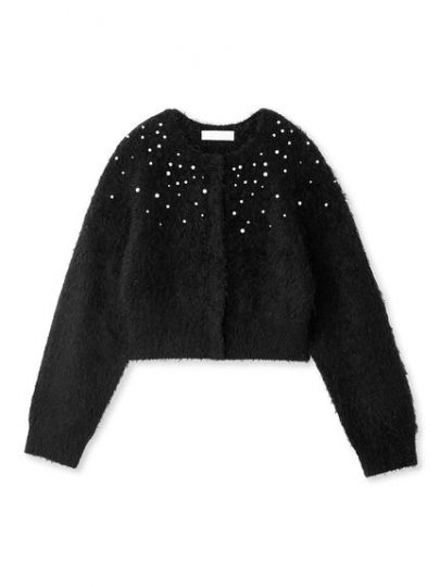ほわほわとしたヘアリーなニットに、細かなパールとビジューをあしらったこちら。ランダムに配置したパール&ビジューで、ぱぁっと顔まわりを華やかな印象に。フロントはスナップボタンで開閉。