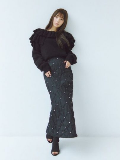 立体感のあるスモッキングジャガードに、パールをあしらった特別感が魅力のスカート。