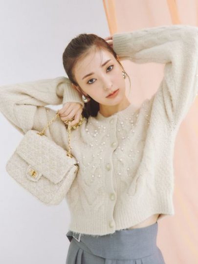 コンパクトなケーブル編みカーデに、袖から身頃にかけてグラデーションのように大小異なるパールを配したデザイン。手仕事感を感じる繊細なディテールが、着こなしにリッチな華やぎをもたらします。