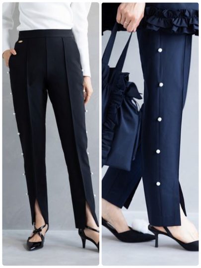 ストレッチの効いたスリムなパンツは、サイドにパールを並べたデザイン。裾のスリットデザインも動きやすく、脚長効果にも貢献。ニットやワンピースにレイヤードして着回したい。