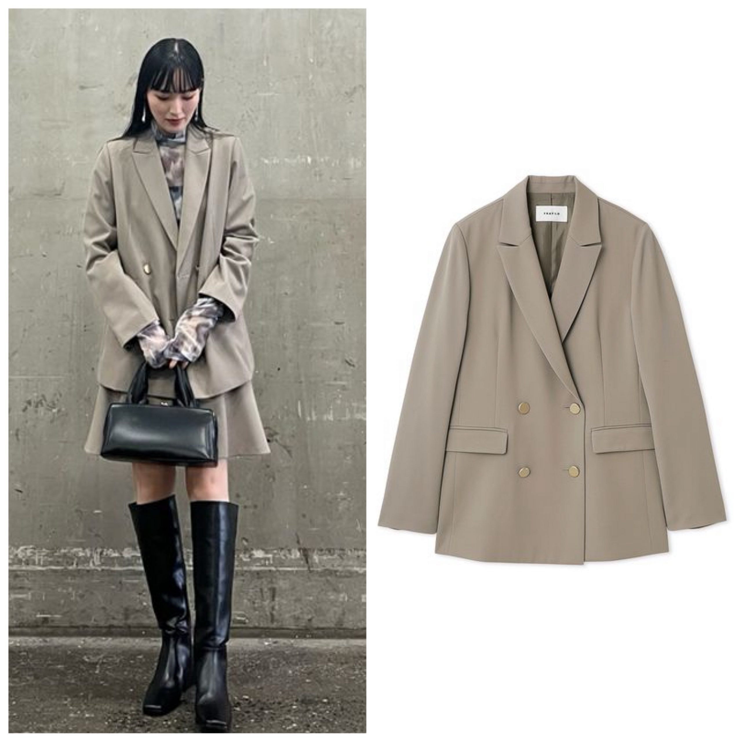 ↑スーツっぽい生地なので、お出かけシーンにもぴったり。ダブルのジャケットはよりクラシカルな印象に仕上がるのが嬉しい。ダブルブレストピークドラベルジャケット/フレイアイディー