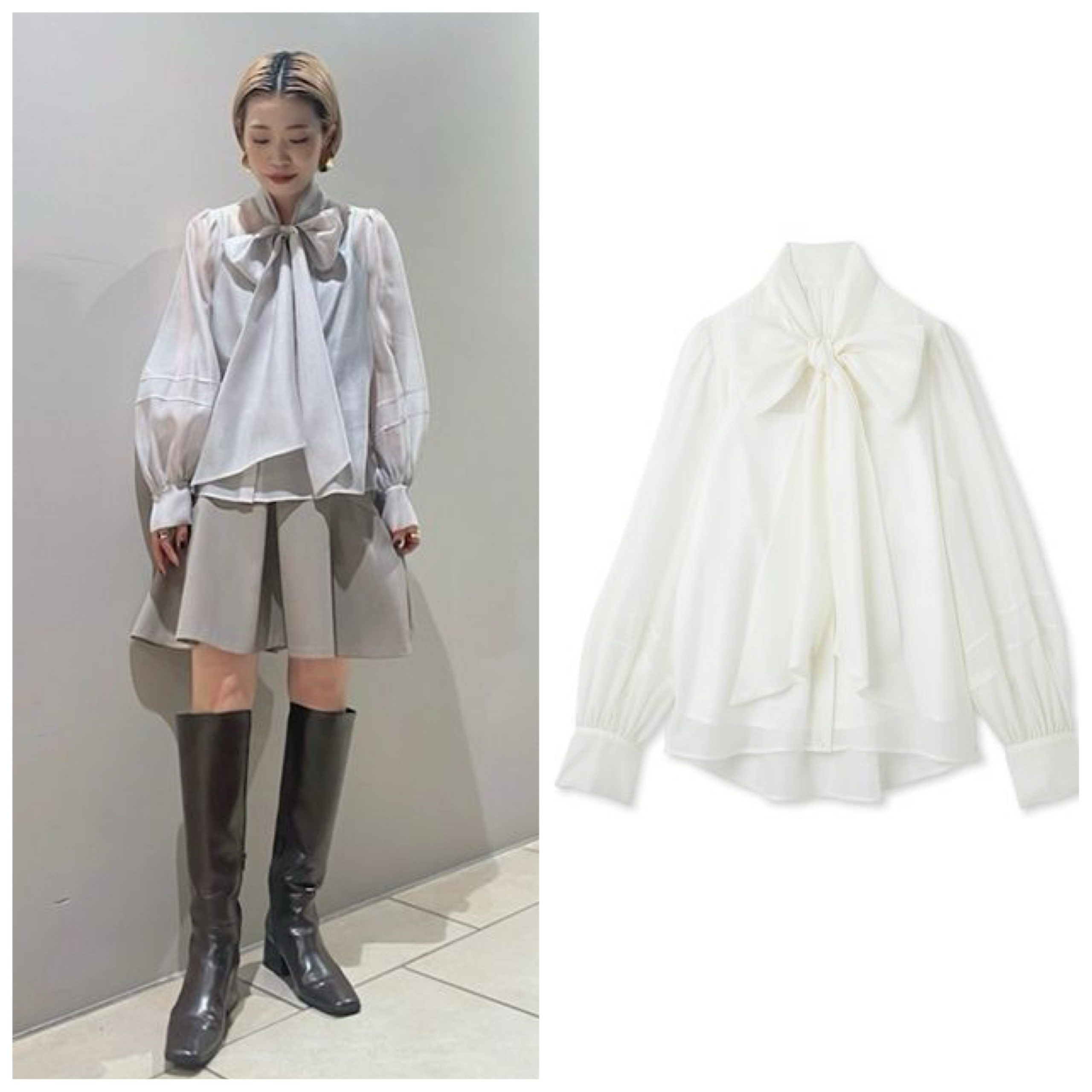 ↑程よいハリ感のあるオーガンジーブラウス。存在感のあるエレガントなデザインなので、ミニボトムに合わせても大人なコーデにしてくれます。オーガンジーボウタイブラウス/フレイアイディー