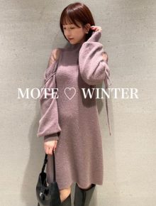 ↑ミニ丈+ゆるっとしたドロップショルダーが色っぽい。ドロップショルダーニットカーディガン/リリーブラウン