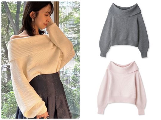 色気を纏いレディに仕上がるオフショルニットが登場。広めの襟は肩まわりを華奢に見せるだけでなく、小顔効果にも期待。