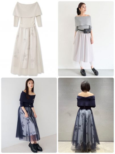 オフショルデザインのトップスにチュールスカートを組み合わせたレディなワンピ。オフショルはワイドな折り返し部分がケープライクでキュート♡
