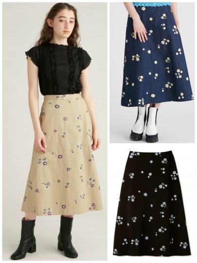 ロングより抜け感のあるミディ丈スカートは、全体バランスを左右するレングス選びが肝。可憐なお花刺繍のデザインでも甘すぎず、ほんのり大人っぽい雰囲気に。