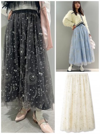 リラクシーにはけるウエストゴムタイプのスカートも、丈の短い00サイズが選べるのが嬉しい。チュール×星座モチーフ刺繍の組み合わせでドリーミーな可愛さを。