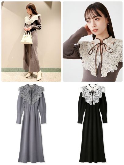オーガンジー素材に刺繍を贅沢にあしらったデコラティブな襟を、ニットワンピにドッキングしたワンピース。ほどよいタイトシルエットが美しいボディラインを演出し、女性らしく着られる1着はデートにもオススメ♡