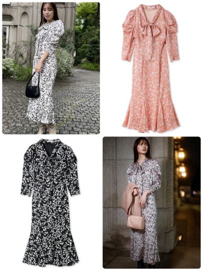 顔まわりを華やかに見せて写真映えするボウタイワンピ。パッと目を引くギャザーを寄せたパフスリーブはパーティーシーンなどにもピッタリ。歩くたびにヒラッと揺れるマーメイドシルエットのスカートでモテも狙えそう♪