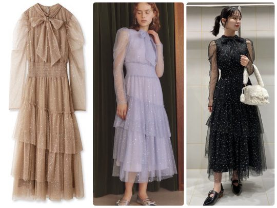 キラキラと輝きを放ち、ロマンティックムードを盛り上げるチュールワンピ。イベントやパーティーなど特別な日に着たい1枚です。