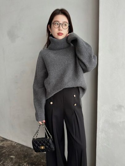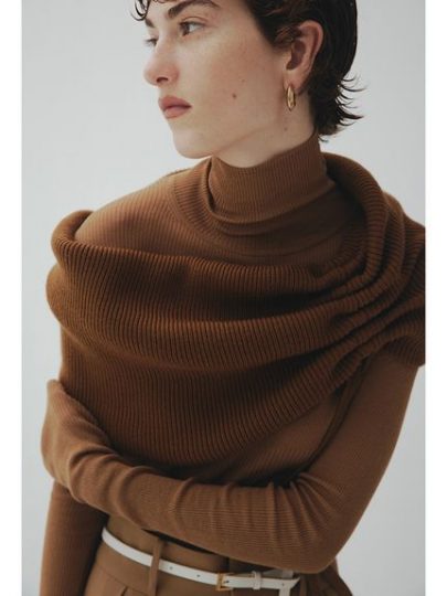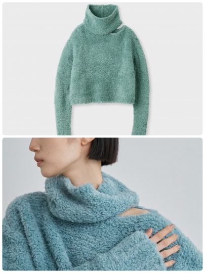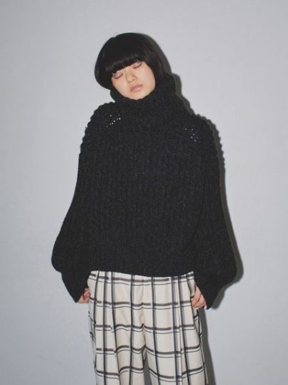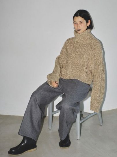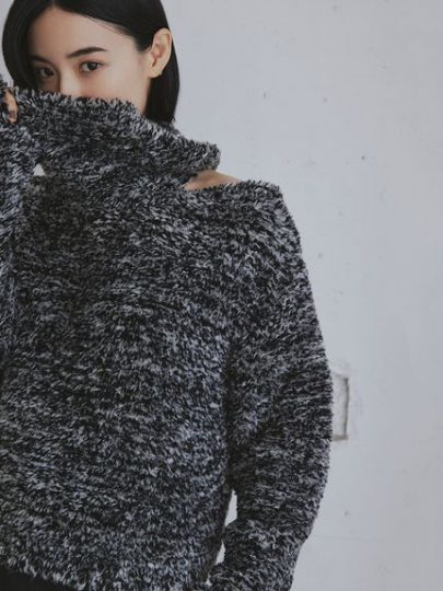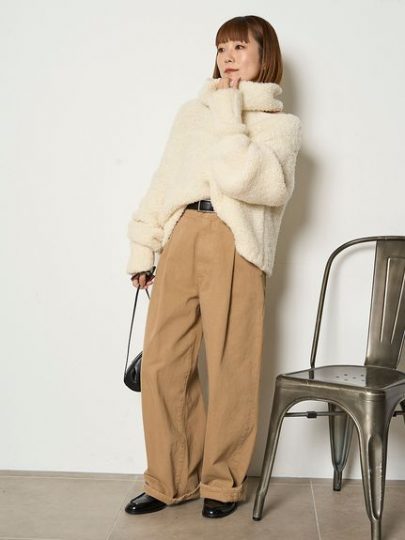 ふわふわな糸を裏目編みにすることで、凹凸感を出して大人っぽく着られる一枚。大きめのタートルは、顔まわりを華やかに見せてくれます。片側の肩部分が開いたデザインで女っぽさもちらり。ワイド感がありつつも短めの丈が着ぶくれを軽減して、スタイルアップを叶えます。