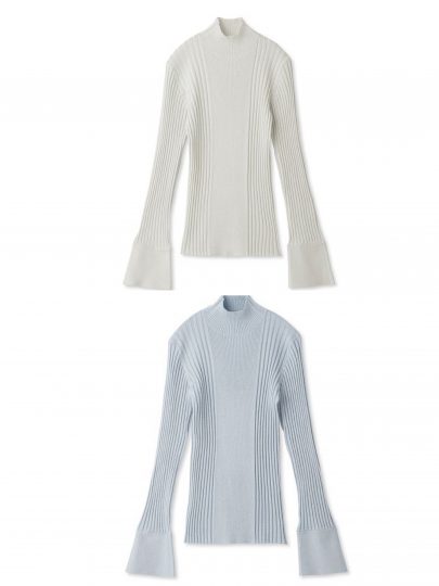 上品なラメ感のあるニットは、袖と身頃でリブの幅を変化させて細見え効果が期待できる一枚。フレアースリーブのワイドな袖口を、アウターからちらっと見せるとこなれ感がアップします。すっきりとしたボディラインだから単品使いはもちろん、レイヤードスタイルのインナーとしてもおすすめです。