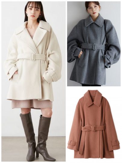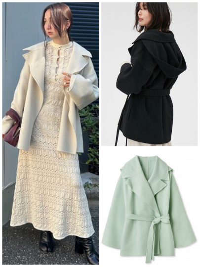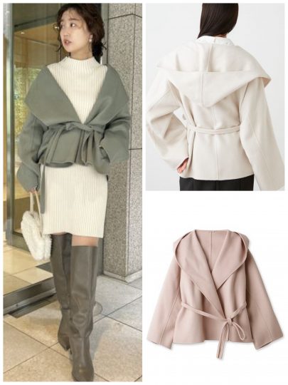 背中のフードへ繋がるショールカラーのような大きな襟が小顔効果バツグン。ゆるっとした形ながらベルトでメリハリがつけられて、ショート丈でも大人な印象です。