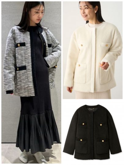 ツイードジャケットのようにレディなルックスで、実は中綿入りという防寒性にも優れたコート。適度なボリューム感とヒップにかかる絶妙な丈で合わせるボトムを選びません。