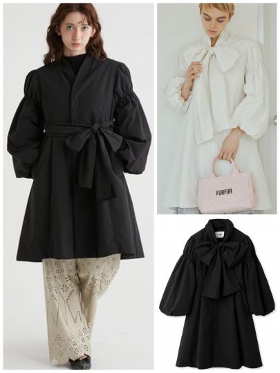 中綿入りのスポーティなアウターを、フレアなシルエットやパフスリーブでFURFURらしい甘さにシフト。大きなリボンは首に巻いても、ベルトとしても使えます。