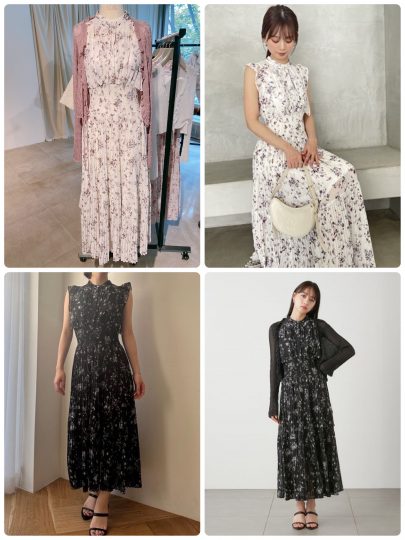 水彩画のような小花柄でスカート部分は2段の切り替えプリーツ。動くたびに華やかな印象を与えてくれます。