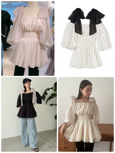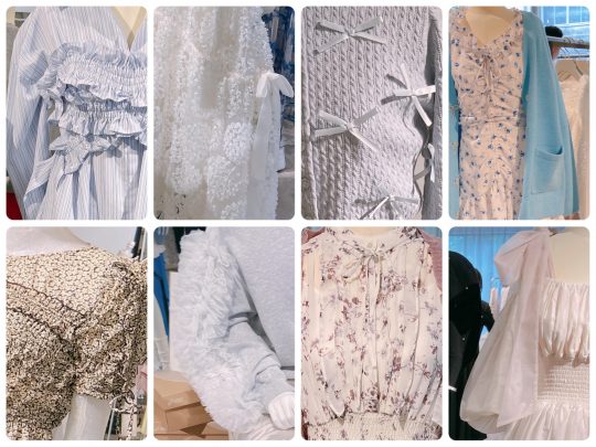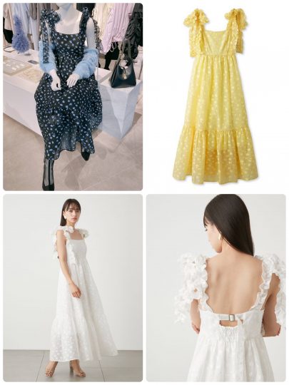さらにフリルやシャーリング、リボンモチーフなど、柔らかくてガーリーなムードには大胆なシルエットで力強さを表現。